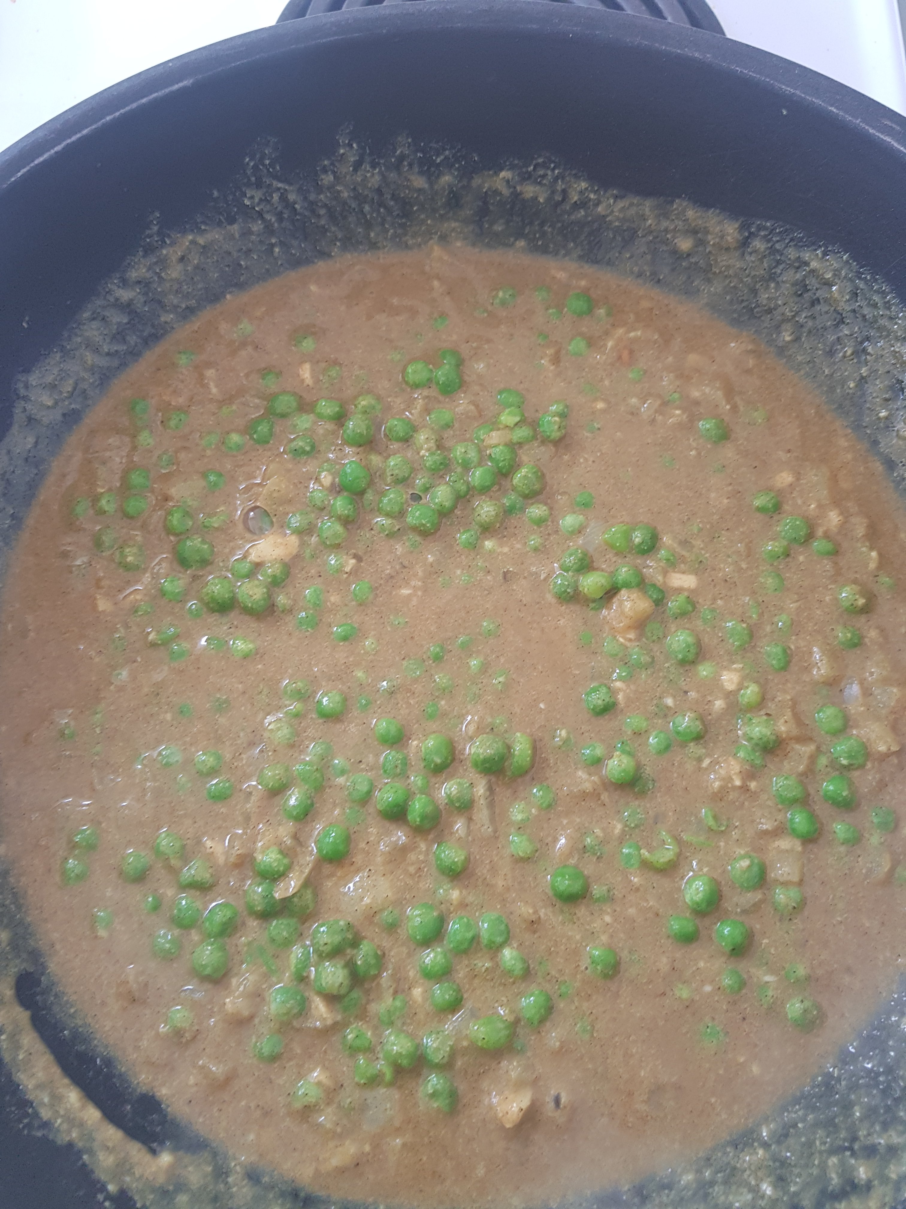 Add half a cup of water and the peas to the onion mixture. Cook for 5 minutes until the mixture has thickened. Take the pan off the heat