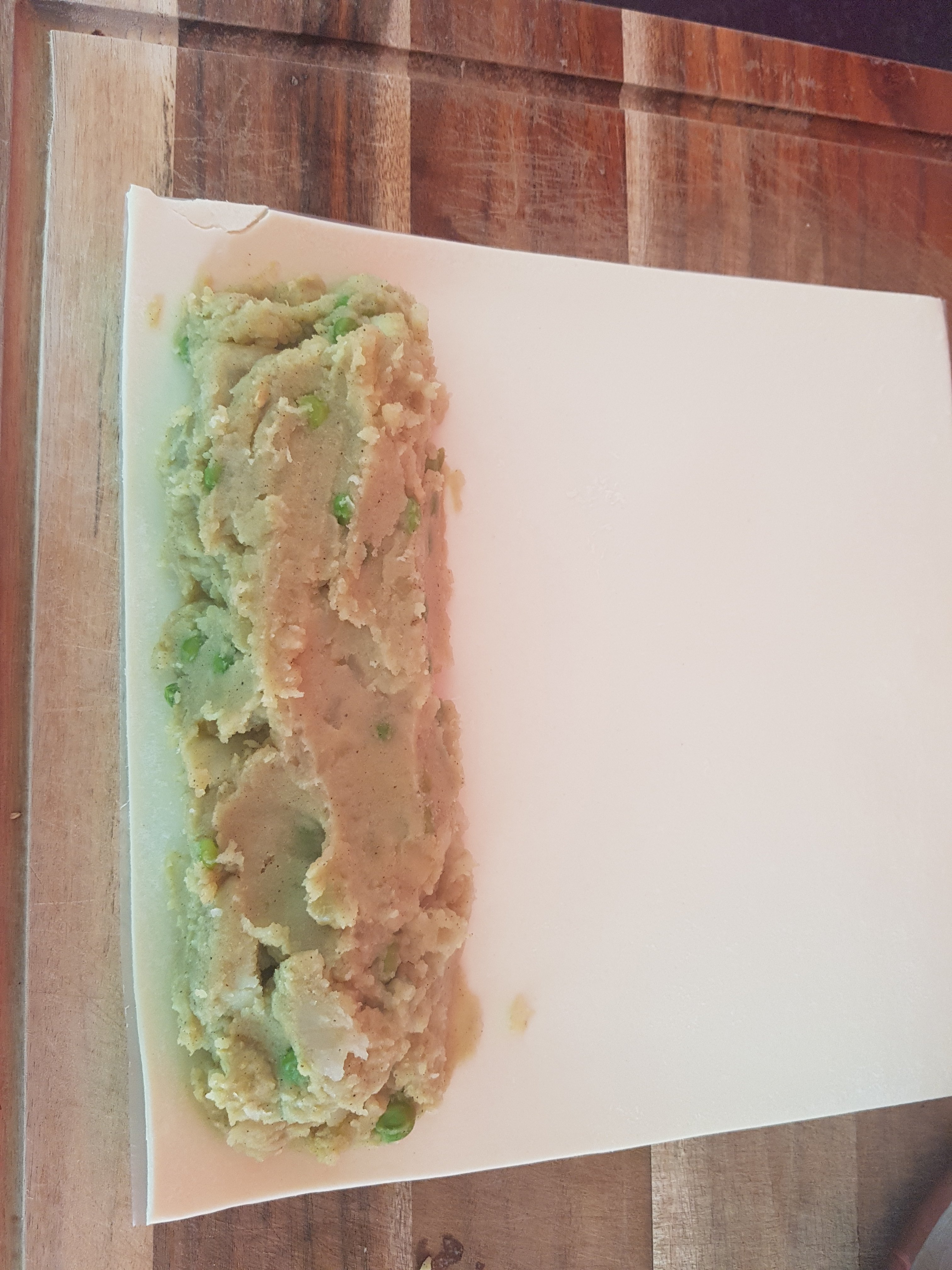 Spoon 1/4 of the potato mixture onto the shortest side the pastry sheet, leaving 1cm from the edge.
